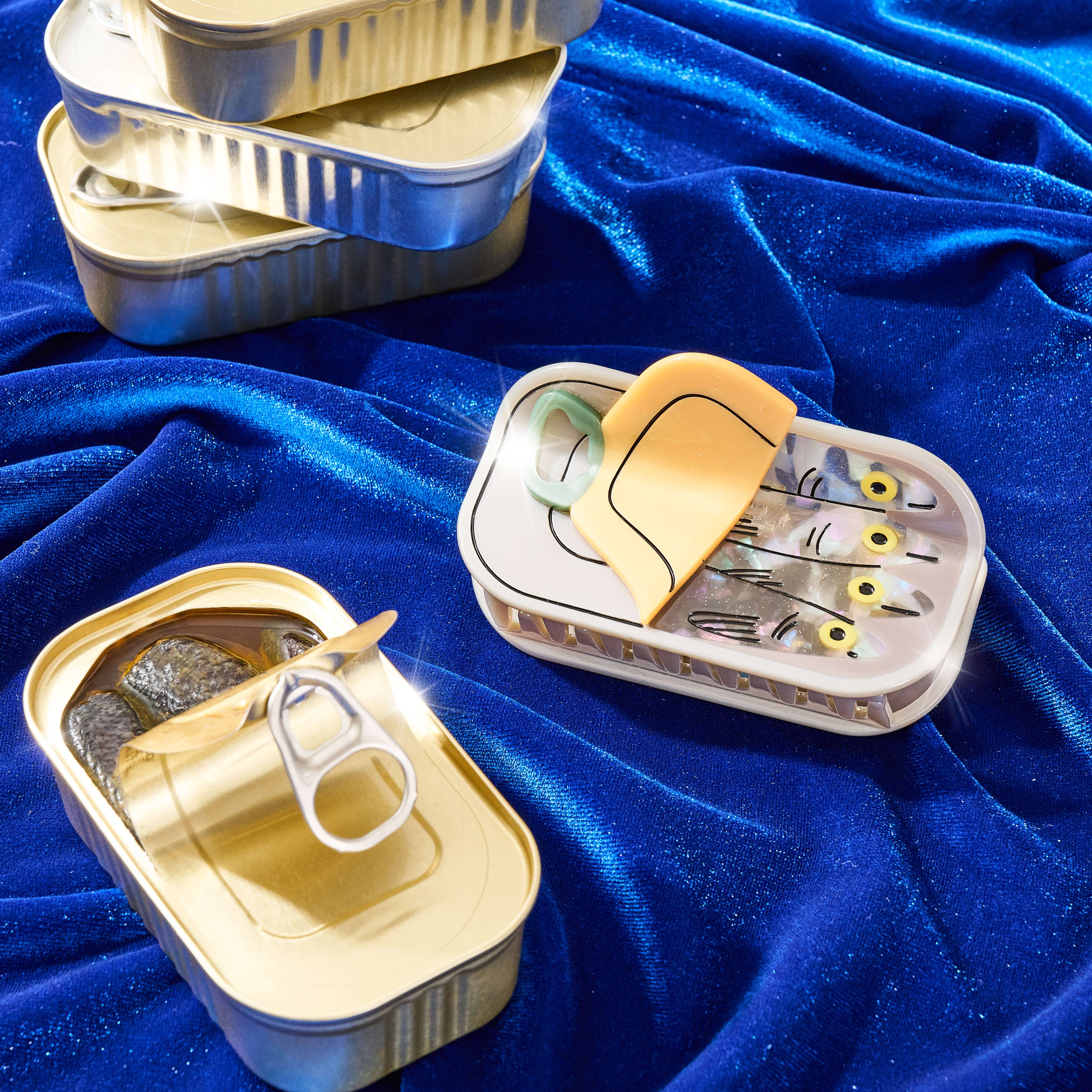 Reel in some fun with our Large Tinned Fish Hair Claw Clip! Measuring about 4" x 2", this playful claw features four little sardines tucked inside a tin. Handmade and hand-painted from eco-friendly cellulose acetate, each piece has unique details. Perfect for seafood lovers, quirky accessory fans, or anyone who wants a sustainable, statement-making hair clip.