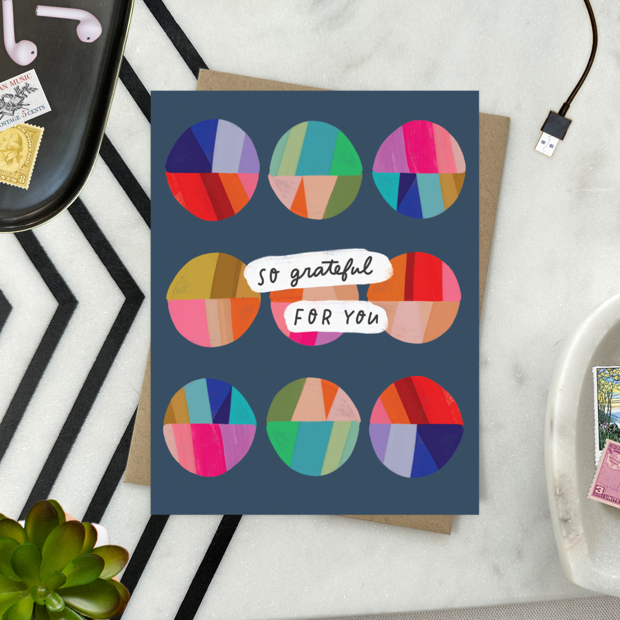 Express your heartfelt gratitude with this vibrant and artistic thank you card! Featuring a grid of colorful, hand-painted patchwork circles and the handwritten words “So Grateful for You,” this design adds a bright and meaningful touch to any message of appreciation. Perfect for anyone looking for thank you cards, artistic greeting cards, or a stylish way to share gratitude.