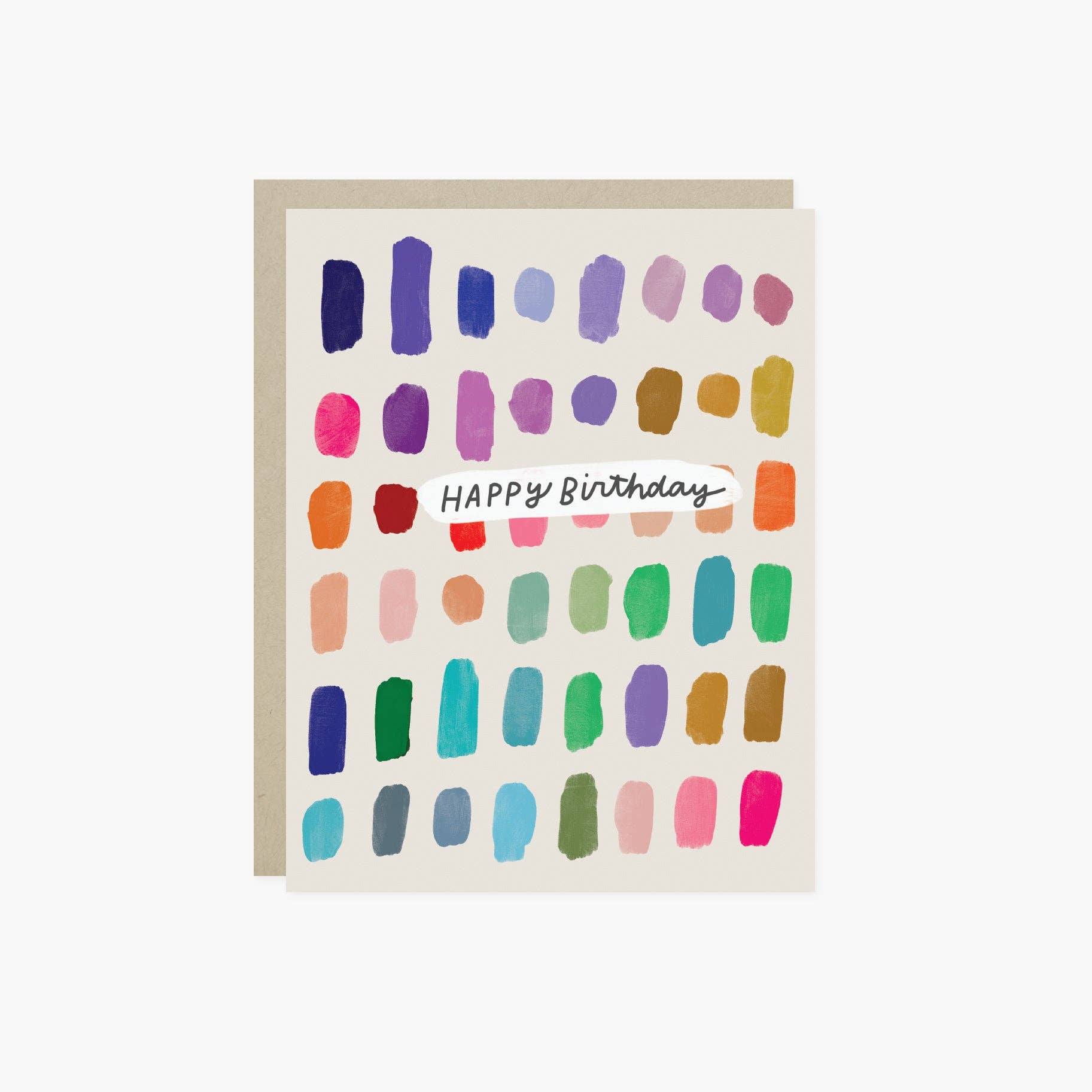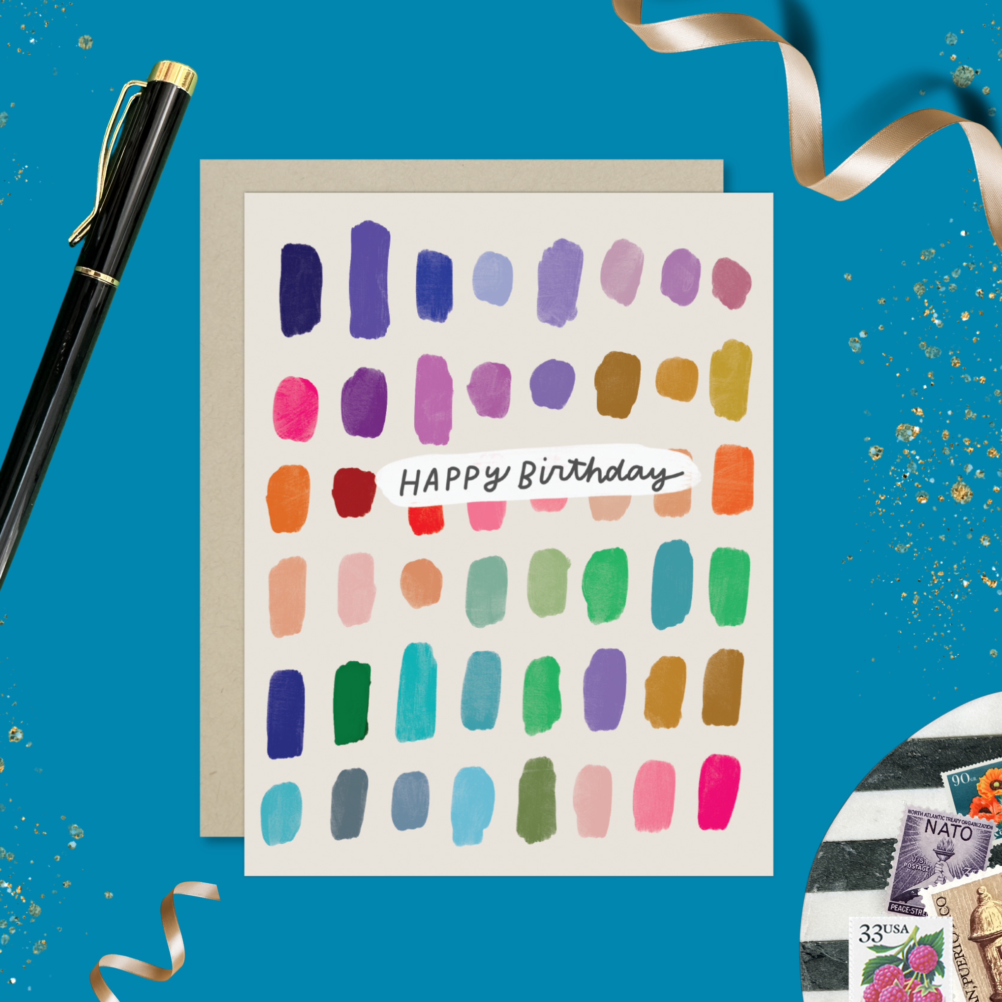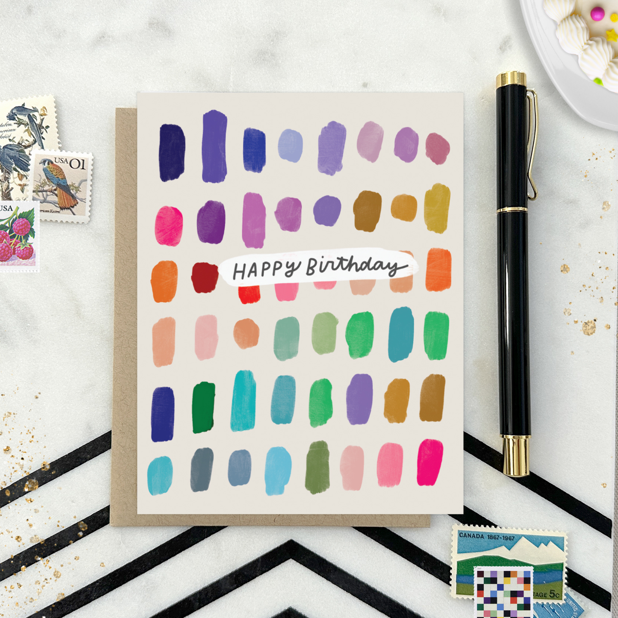 Celebrate their special day with this vibrant and artistic birthday card! Featuring painterly swatches in bold, cheerful colors and hand-lettered “Happy Birthday” text, this design is sure to brighten anyone’s day. Perfect for those looking for colorful birthday cards, artistic greeting cards, or a modern way to send birthday wishes.