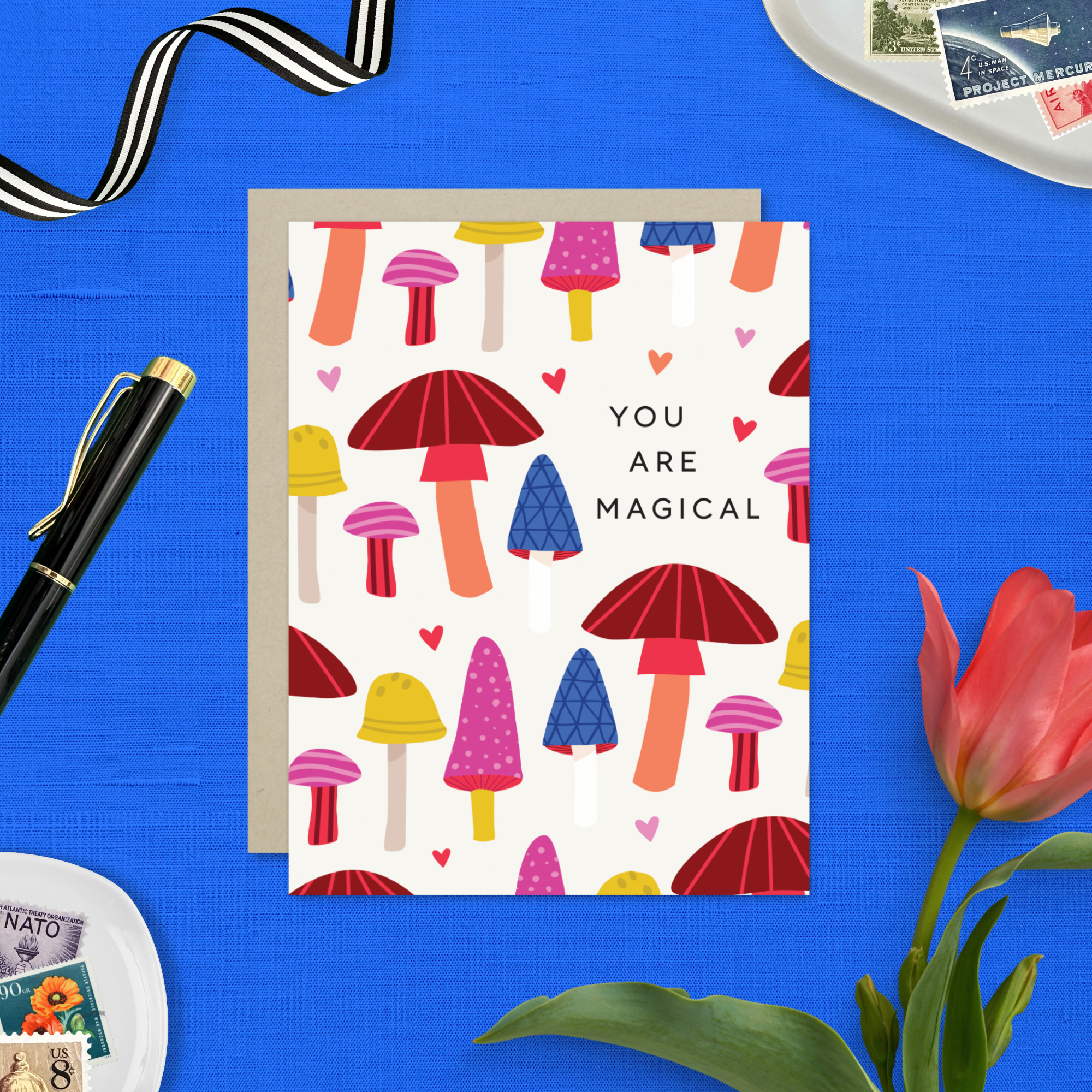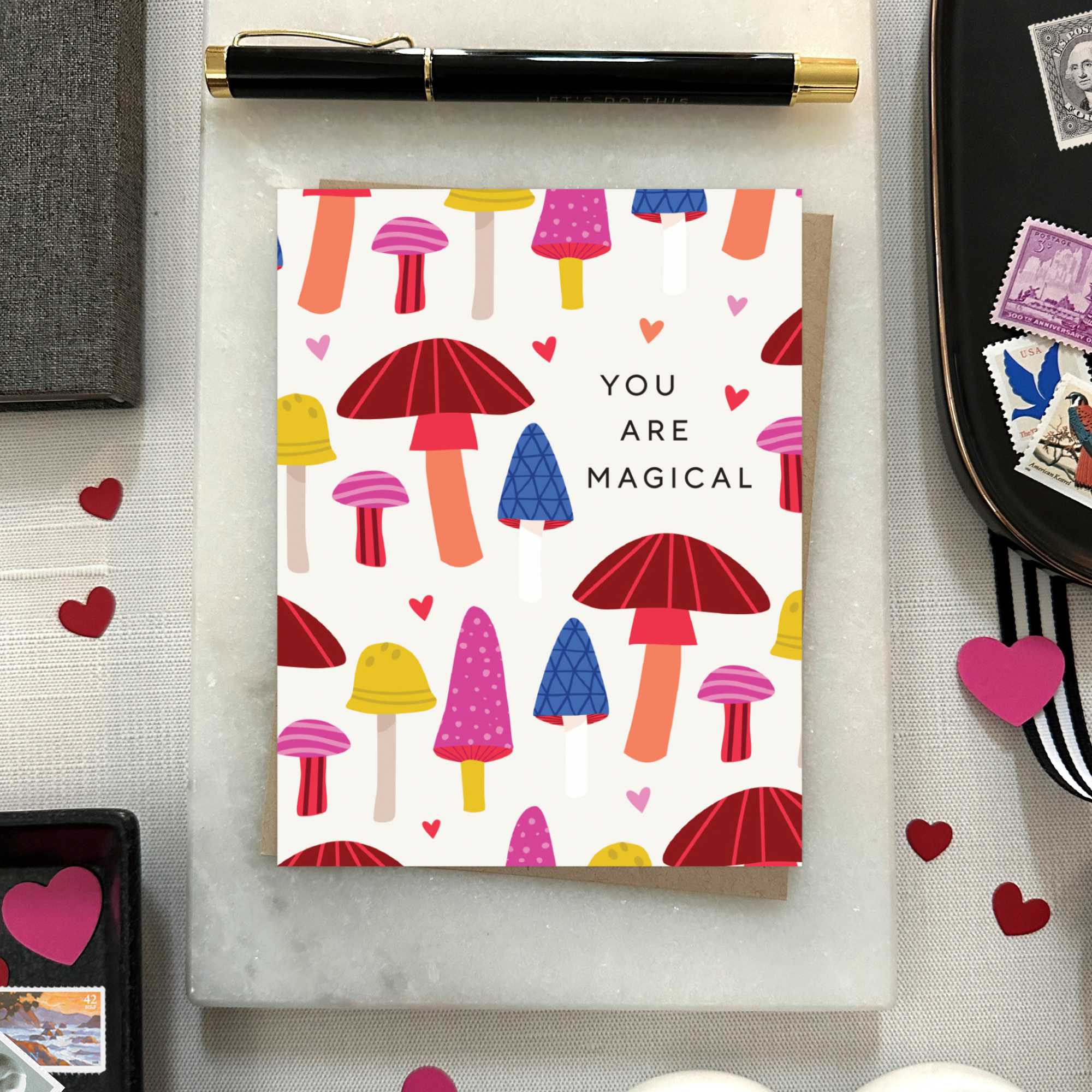 A little whimsy, a little wonder, and a whole lot of love! This vibrant and enchanting greeting card features colorfully illustrated mushrooms and the uplifting message: “You are magical.” Whether for Valentine’s Day, a birthday, or just because, this card is perfect for reminding someone how truly special they are. A dreamy choice for anyone who loves a touch of magic, nature, or a little bit of both!